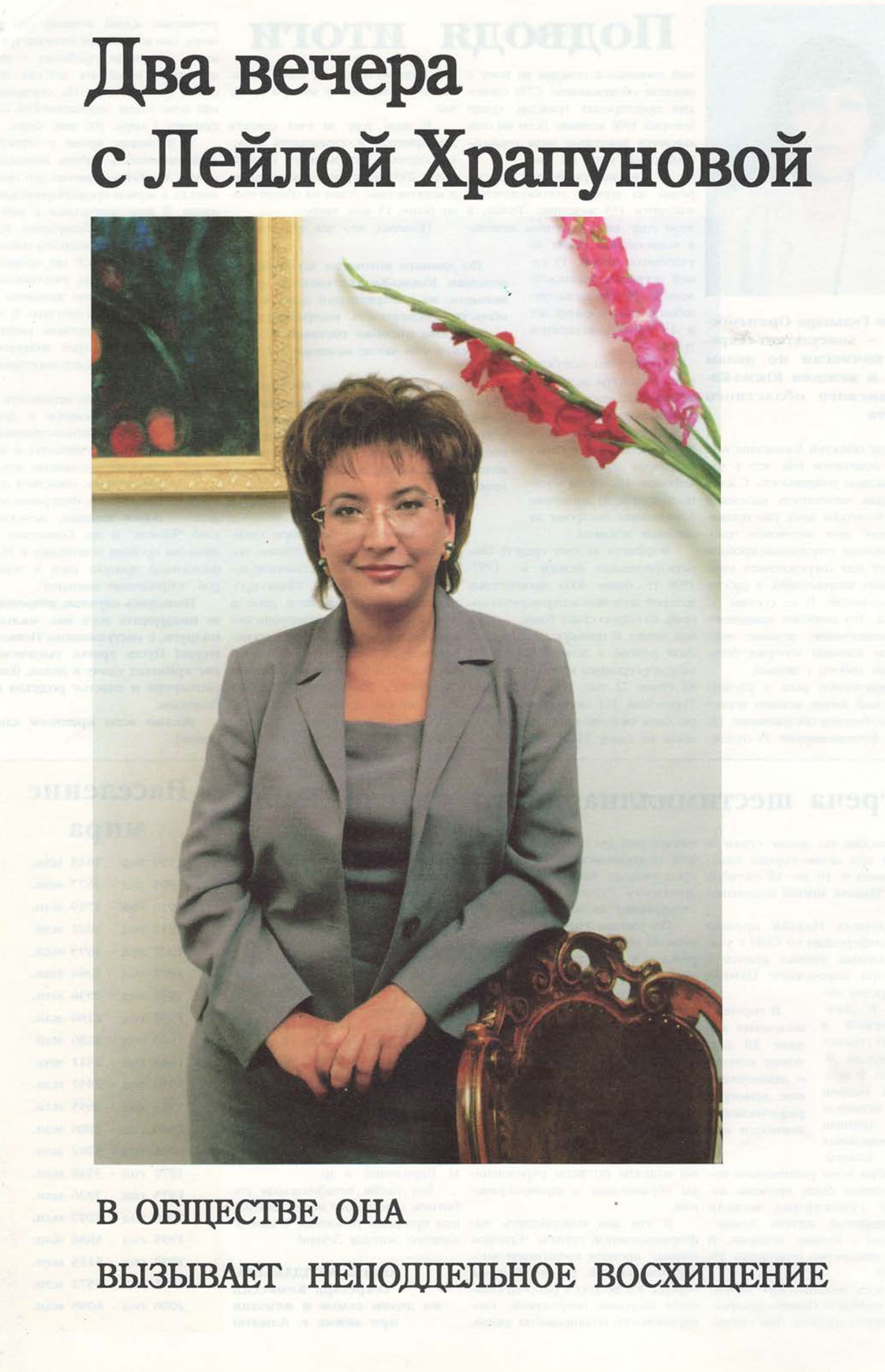 Хотя у госпожи Бекетовой2 и нет журналистского образования, в традиционном понимании, в делах телевидения она специалист, каких мало. Достаточно сказать, что телевизионную “кухню” Лейла Калибековна изучила с самых азов. В те времена, когда у нас еще было только государственное телевидение, она пришла туда ассистентом режиссера.”