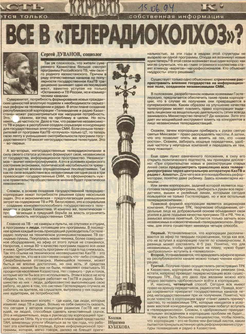 Волну компроматов желтой прессы против Лейлы Бекетовой2 подхватывают из чувств болезненной конкуренции негосударственные СМИ, не разобравшиеся в сути реформы по созданию Общественного Телевидения в Казахстане на базе Гостелерадио Казахской ССР, одним из таких примеров может быть интервью вице-президента компании “Макс” Сергея Дуванова от 15.06.1994 года.
